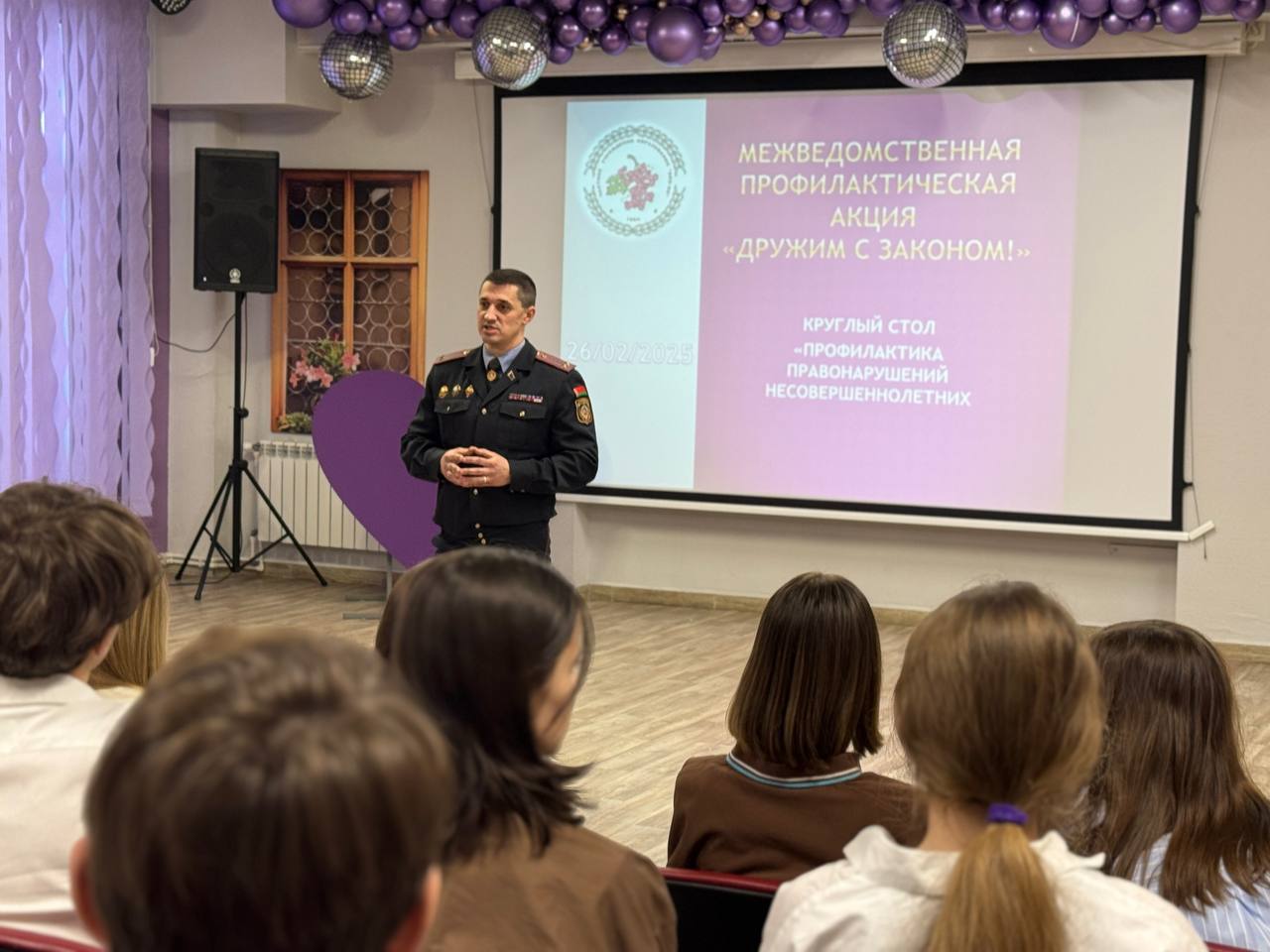 Сегодня в рамках межведомственной профилактической акции «Дружим с Законом!» в гостях у наших 7-9 кл. был заместитель начальника отдела профилактики управления правопорядка и профилактики ГУВД Мингорисполкома (начальник ИДН г. Минска).
